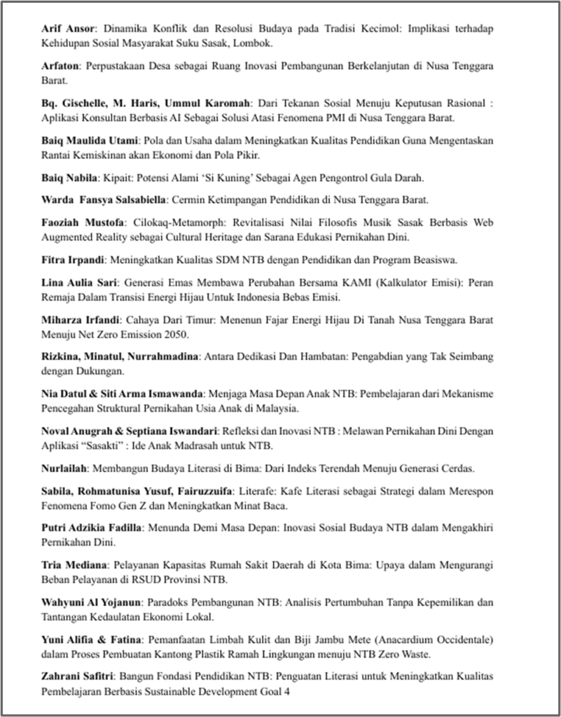 Terima kasih yang sebesar-besarnya kami sampaikan juga kepada seluruh tim inisiator yang sudah bekerja keras, para penulis yang sudah menyumbangkan gagasannya, penerbit, serta semua pihak yang mendukung hingga buku ini bisa diterbitkan. Semoga buku ini bisa menjadi pemantik diskusi yang bermanfaat dan mendorong lebih banyak lagi karya hebat dari anak muda Nusa Tenggara Barat di masa depan.