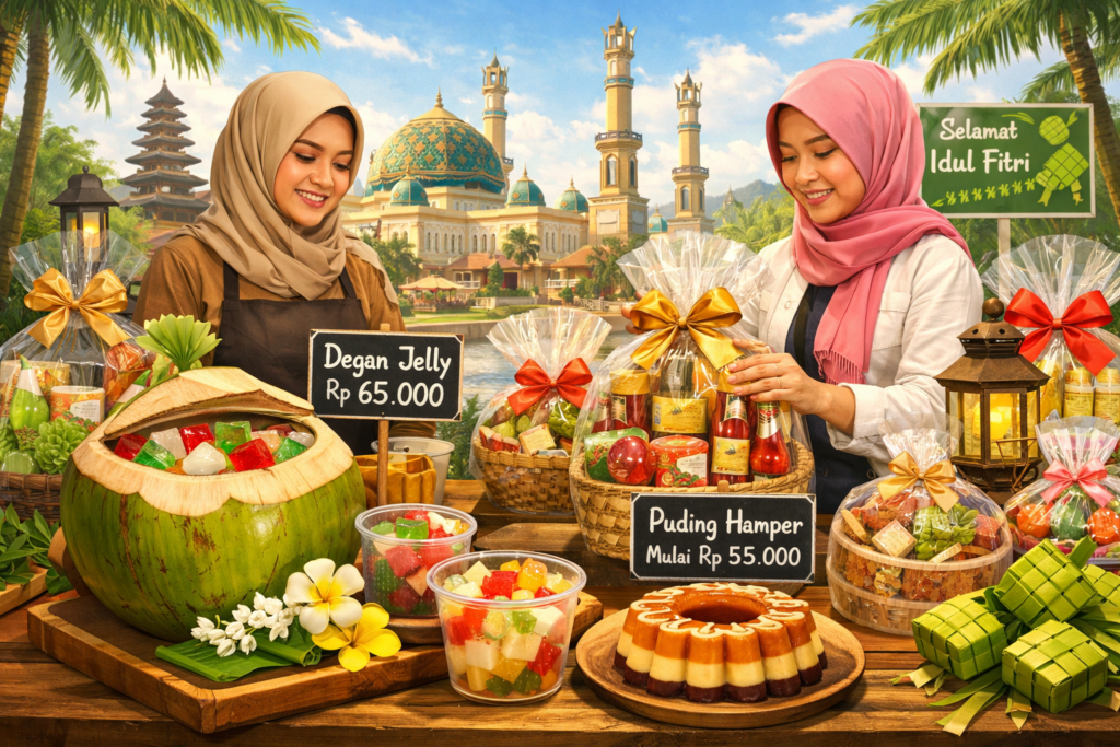 kicknews.today – Menjelang Hari Raya Idulfitri, permintaan hamper atau hantaran di Kota Mataram mengalami peningkatan signifikan. Menariknya, tren hamper tahun ini tidak lagi didominasi kue kering, melainkan mulai bergeser ke produk yang lebih segar dan unik, seperti degan jelly.